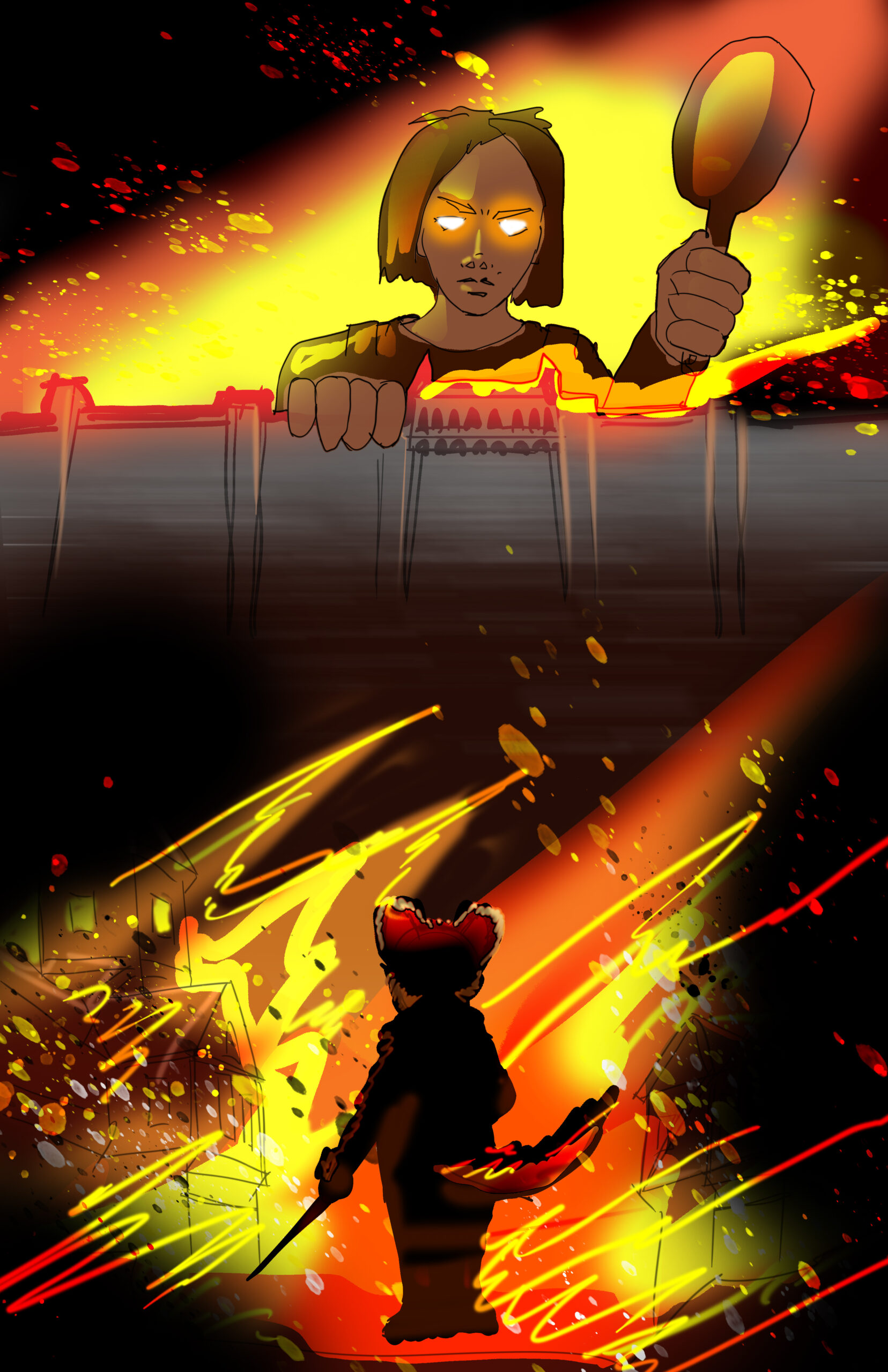 The Hobgoblin looked up from the fire. He’d been outside, training, when the skies had been unkind enough to dump on him. He waved at Octavia and jerked a thumb at the kitchen.