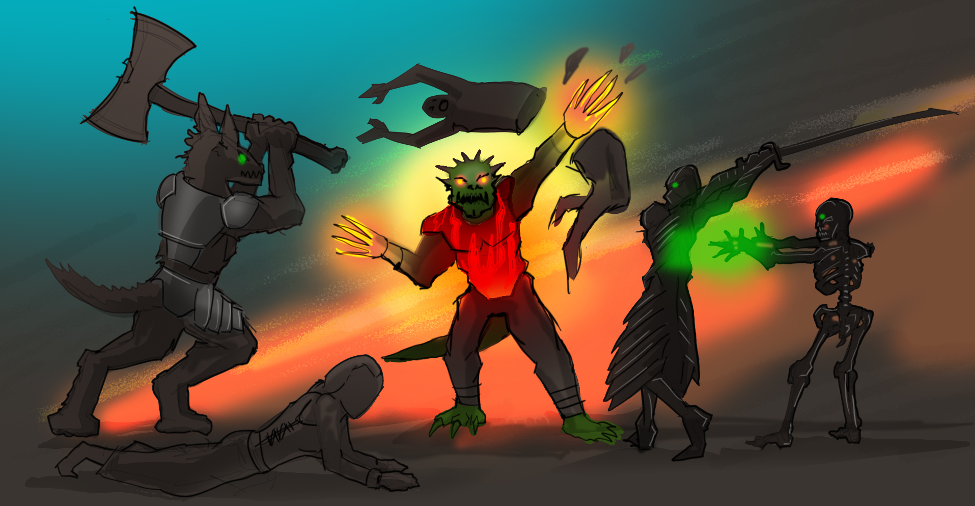 An angry ape, a Human from A’ctelios Salash armed with a dagger. The sea serpents closed in.