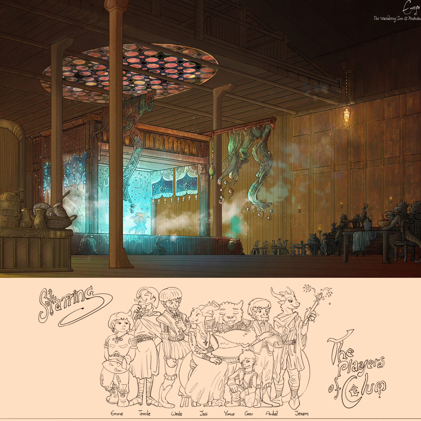 What feels best for now and what for the story? These are the quandaries. For now, I’m going to leave you with some great art. Enuryn’s Players of Celum, for one! I think it’s perfect, don’t you? And I’ve been holding onto it for a while!