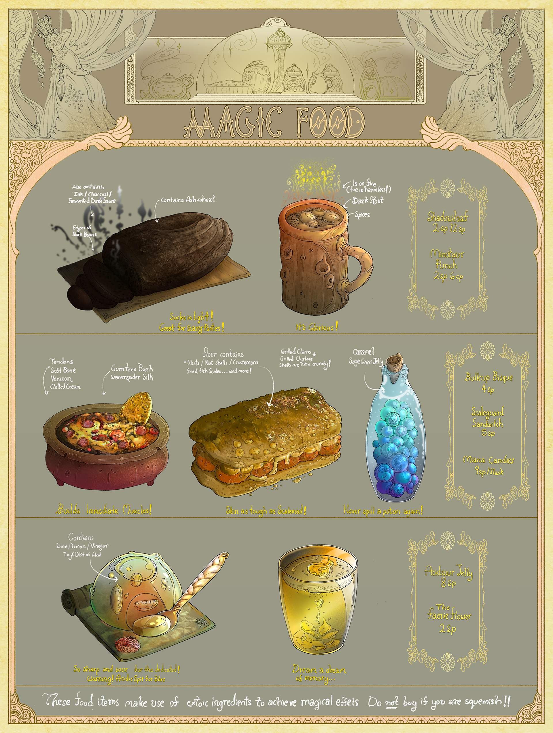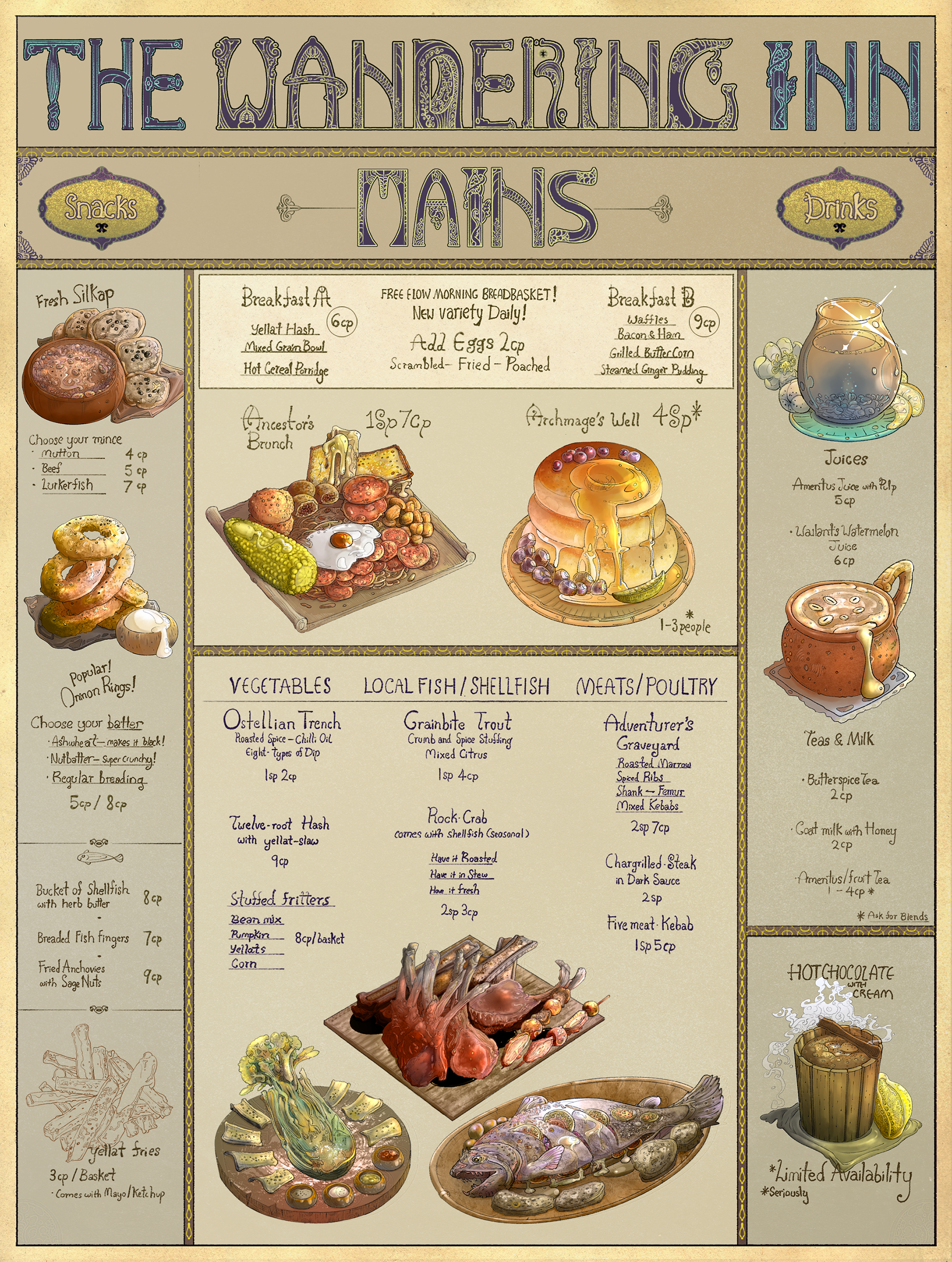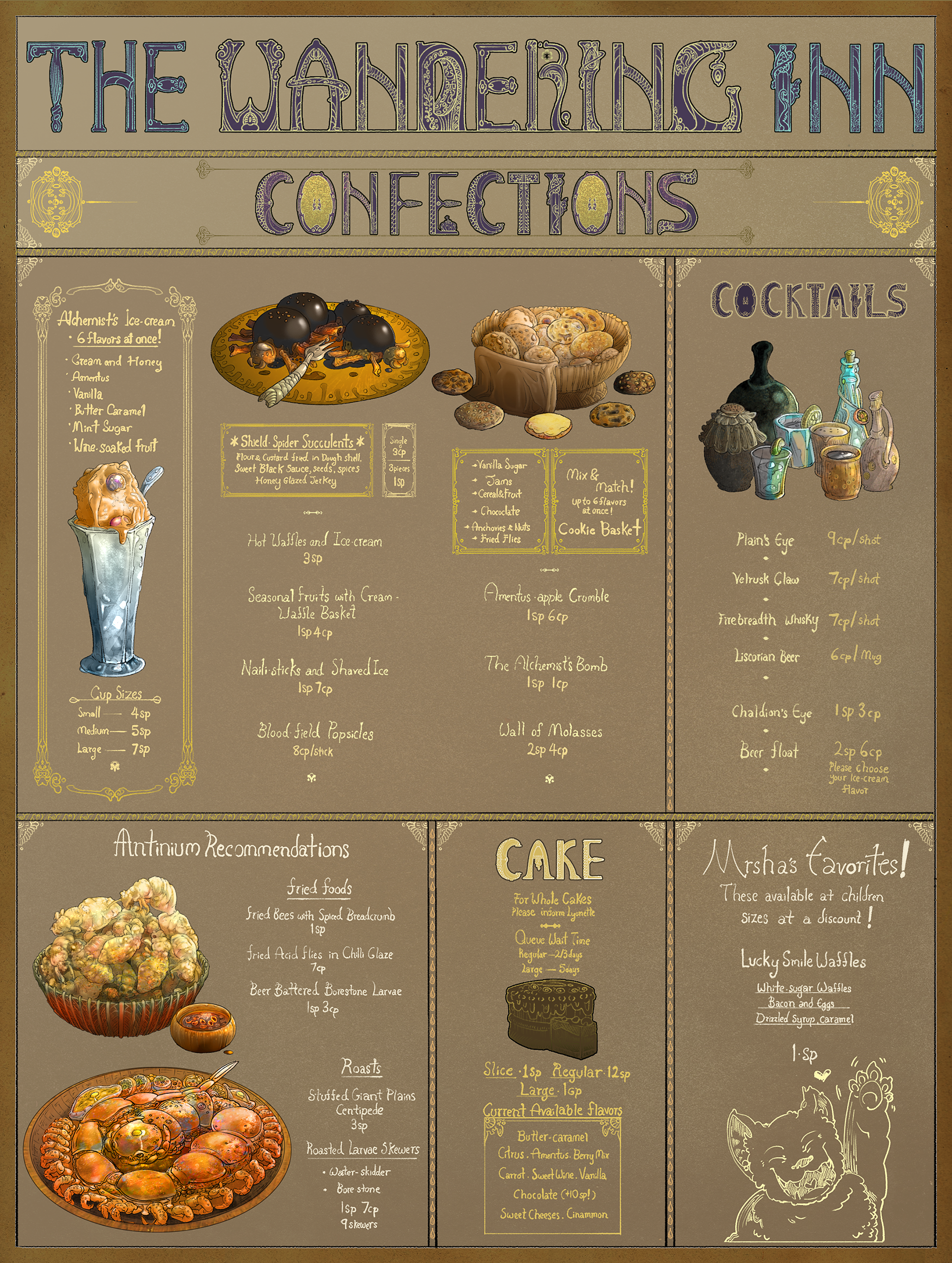 Writing choices. At any rate, I’m back. I hope you enjoy this first chapter, and the amazing art of Enuryn’s that has just been done! The Wandering Inn’s menu, in high-res detail! All the things you can’t eat at the moment!